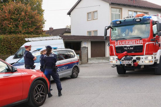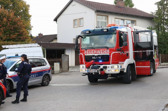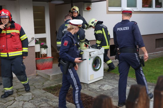 Einsatzkräfte bei Brand einer Waschmaschine in einem Einfamilienhaus in Wels-Lichtenegg im Einsatz