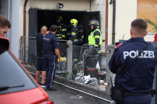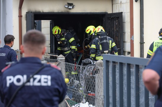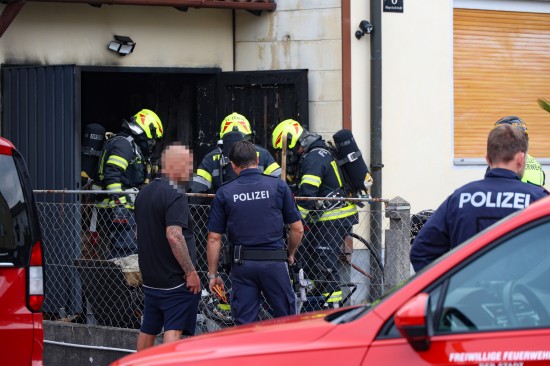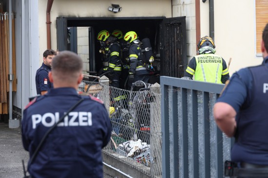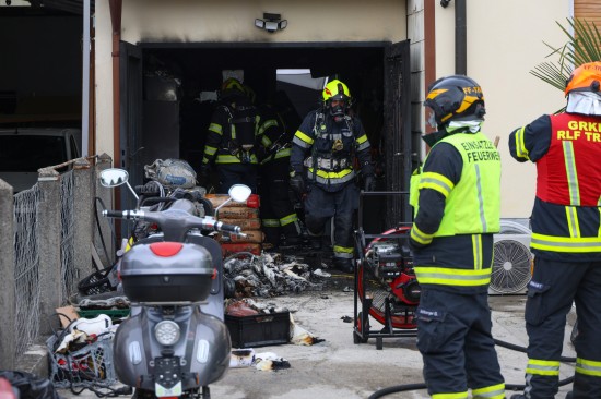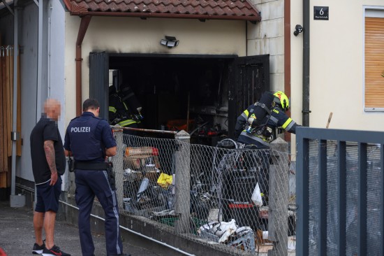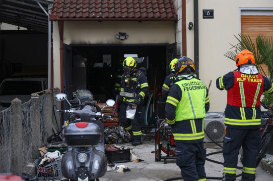 Einsatzkräfte bei Brand in einer Garage in Traun im Einsatz