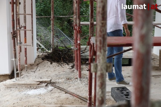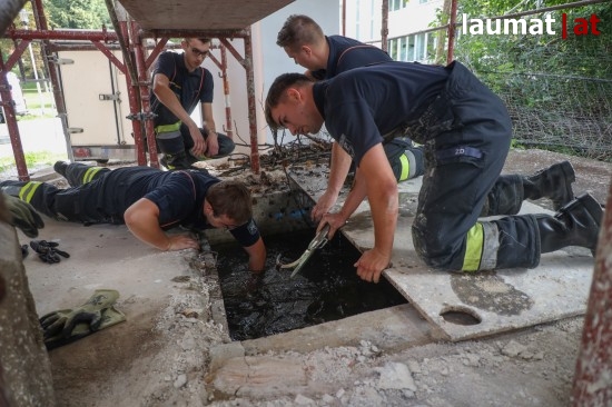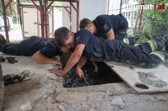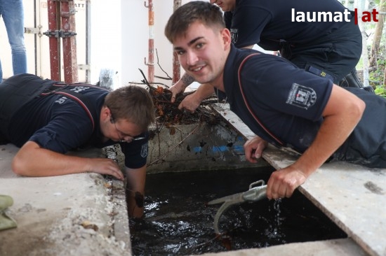 Einsatzkräfte der Feuerwehr standen Freitagvormittag bei einer Verklausung an einem Nebenarm des Welser Mühlbachs - auch als Gießerbach bekannt - im Einsatz.