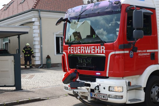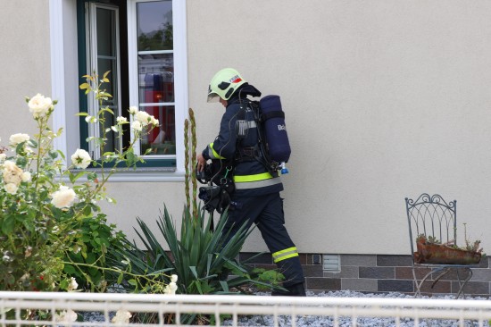 Einsatzkräfte der Feuerwehr bei Brandnachschau in einem Wohnhaus in Wels-Schafwiesen im Einsatz
