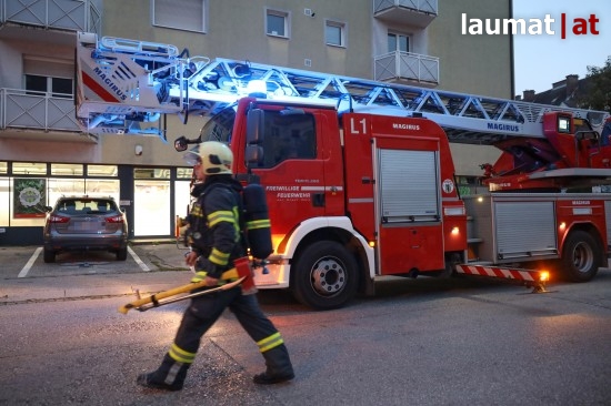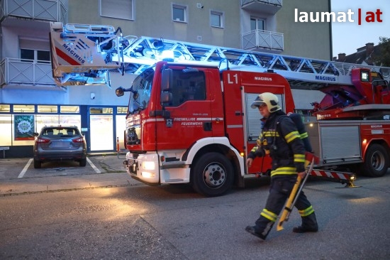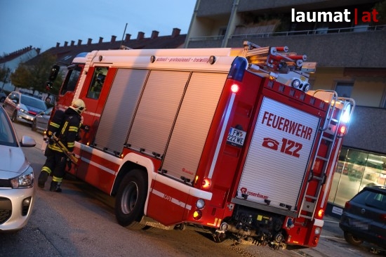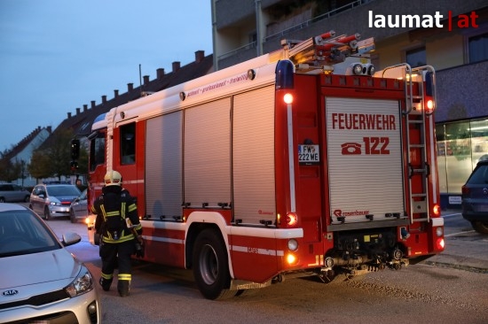 Einsatzkräfte der Feuerwehr nach vermeintlicher Explosion in Wels-Vogelweide im Einsatz