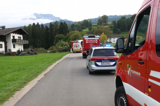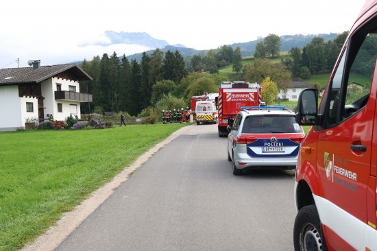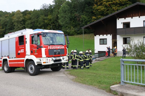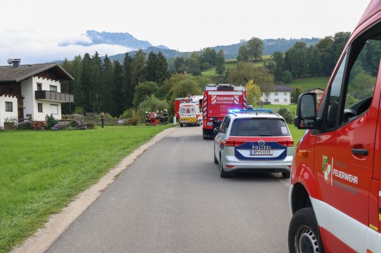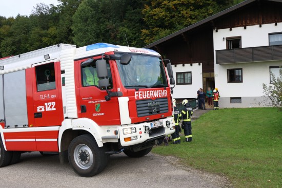 Einsatzkräfte zweier Feuerwehren bei Küchenbrand in einem Wohnhaus in Gschwandt im Einsatz