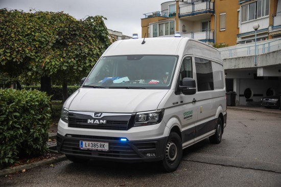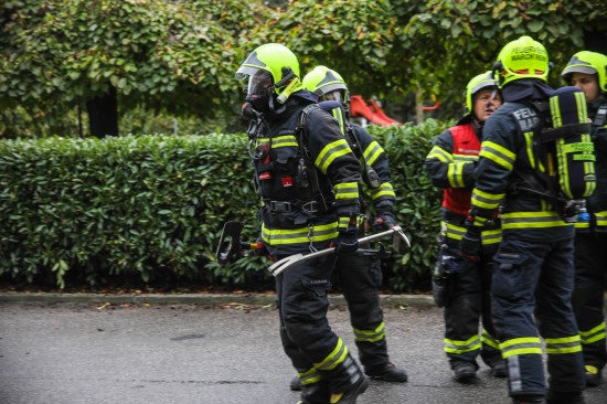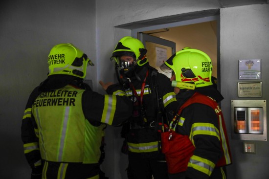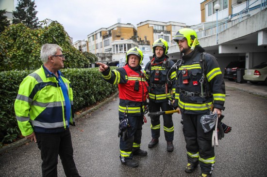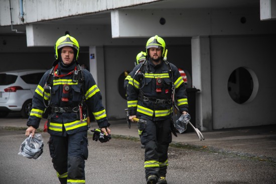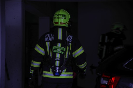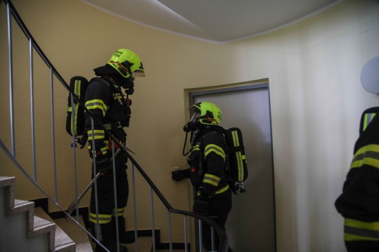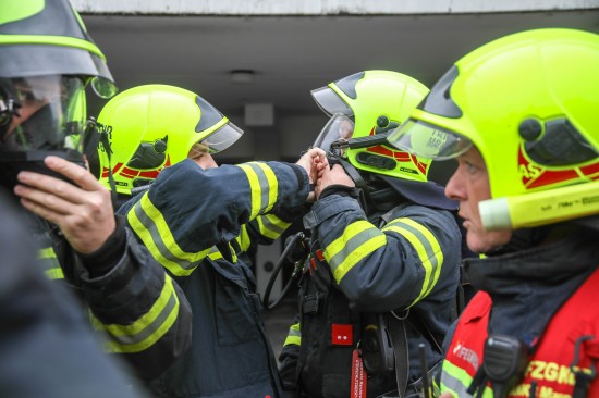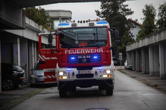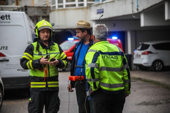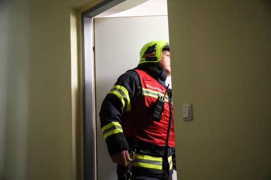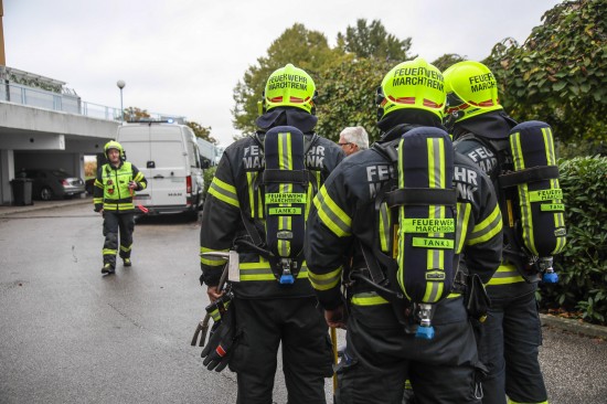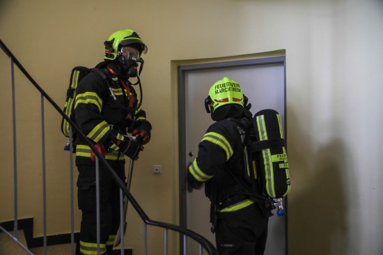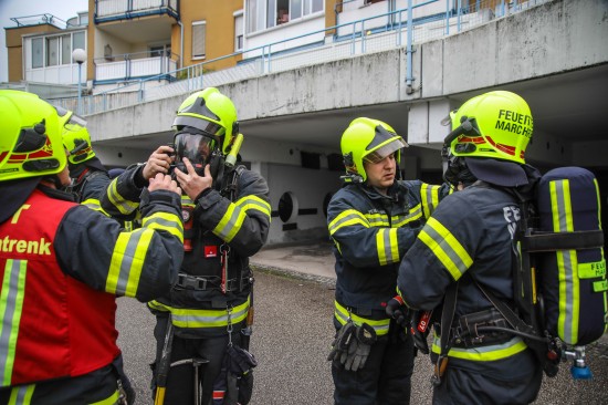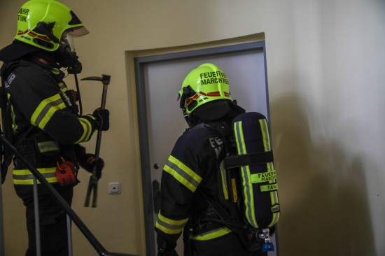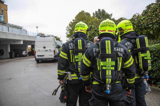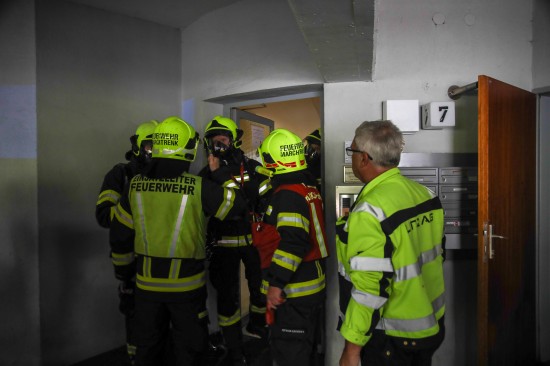 Einsatzkräfte zweier Feuerwehren bei CO-Austritt in Mehrparteienwohnhaus in Marchtrenk im Einsatz