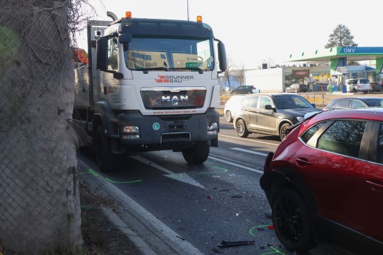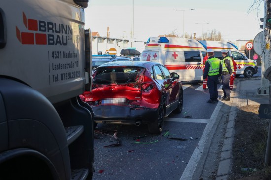 Der Unfall passierte auf der B137 Innviertler Straße, Osttangente, unmittelbar vor der Kreuzung mit der B1 Wiener Straße, Hans-Sachs-Straße und dem Weiglweg im Welser Stadtteil Pernau. Aus noch unbekannter Ursache fuhr ein LKW auf einen PKW auf. Der PKW wurde im Heckbereich schwer beschädigt. Der Rettungsdienst war mit zwei Fahrzeugen vor Ort, ebenso die Polizei. Zwei Personen wurden bei dem Unfall leicht verletzt.