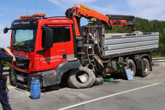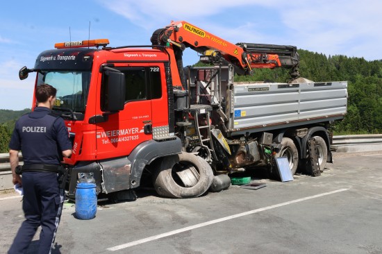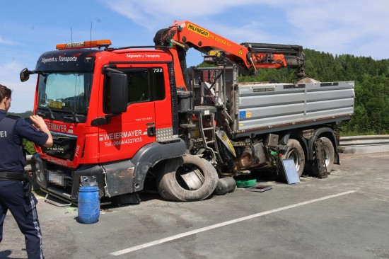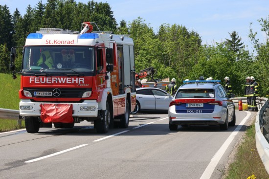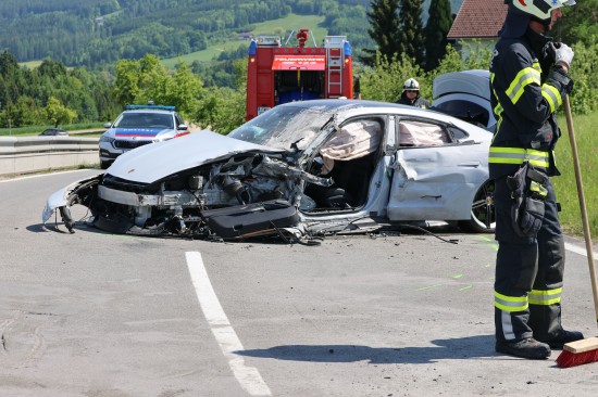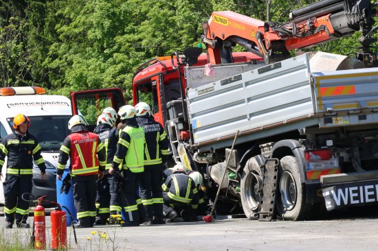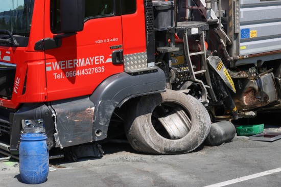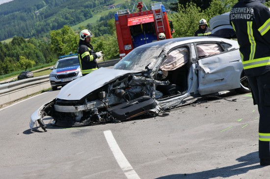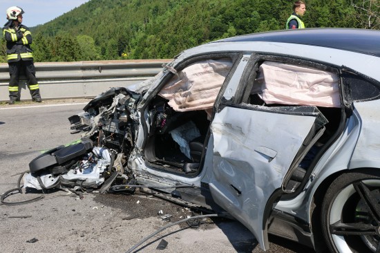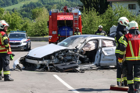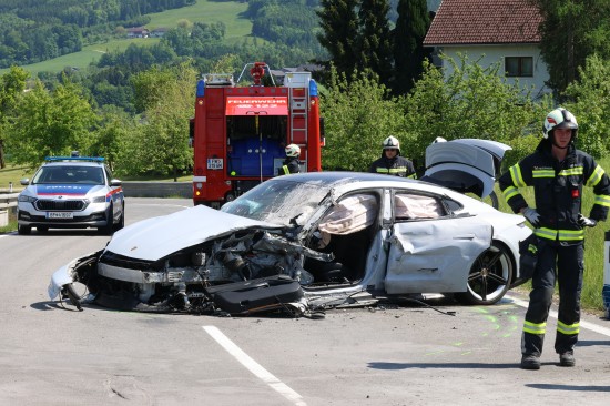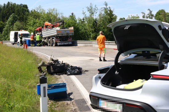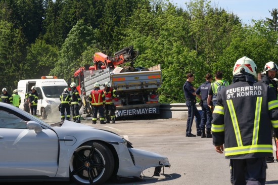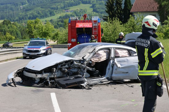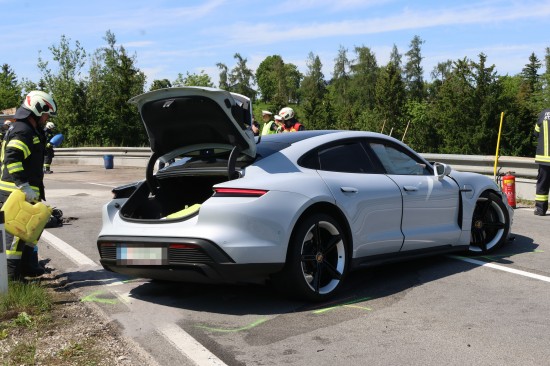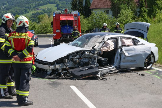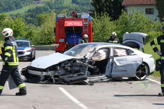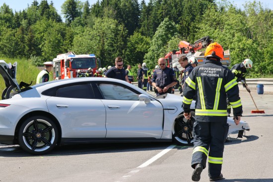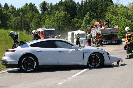 "Am 20. Mai 2025 kam es auf der B120 Scharnsteiner Straße im Gemeindegebiet von Gschwandt zu einem Verkehrsunfall, bei dem ein 63-Jähriger aus Innsbruck mit seinem E-Porsche in Richtung Scharnstein unterwegs war. Zur gleichen Zeit fuhr ein 50-Jähriger aus dem Bezirk Gmunden seinen mit Schotter beladenen LKW in Richtung Gmunden. In einer Rechtskurve geriet der Lenker des Porsche aus bislang ungeklärter Ursache auf die Gegenfahrbahn und kollidierte seitlich mit dem LKW. Beide Fahrzeuge wurden fahrerseitig erheblich beschädigt. Der Lenker des E-Porsche wurde von der Rettung mit Verletzungen unbestimmten Grades in das Salzkammergut Klinikum Gmunden verbracht. Der Lenker des LKW blieb unverletzt. Aus dem LKW und dem Porsche traten größere Mengen Betriebsmittel aus, die durch die Feuerwehr gebunden werden mussten. Die Feuerwehr sicherte weiters die Unfallstelle ab, stellte den Brandschutz sicher und sicherte das Elektrofahrzeug bis zur Abschleppung. Eine auf LKW-Bergungen spezialisierte Firma übernahm die Abschleppung des LKW. Die B120 Scharnsteiner Straße war für die Dauer der Unfallerhebung und die Aufräumarbeiten zwischen Kranichsteg und Gschwandt für ca. dreieinhalb Stunden gesperrt."