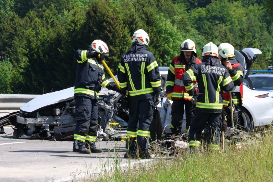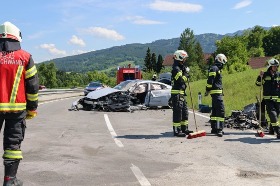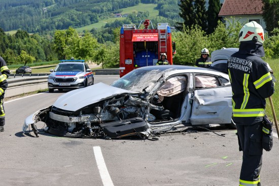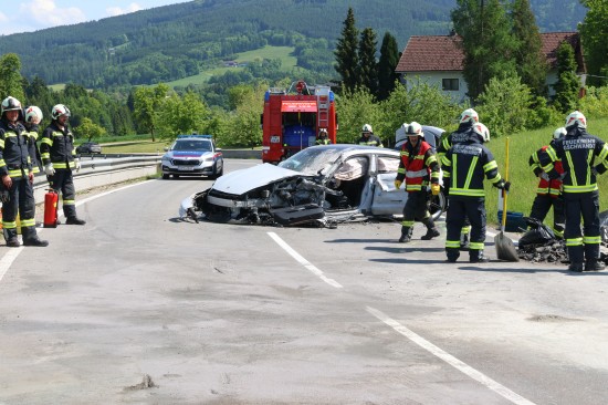 Der folgenschwere Unfall ereignete sich Dienstagnachmittag auf der B120 Scharnsteiner Straße, Schloßberg, im Gemeindegebiet von Gschwandt. Ein Elektro-Sportwagen ist dort aus noch unbekannter Ursache in einer Kurve offensichtlich gegen einen entgegenkommenden Schotter-LKW gekracht. Der exklusive Sportwagen wurde dabei auf einer Seite schwerste beschädigt. Der LKW wurde ebenso auf der linken Seite schwer beschädigt. Aus dem Tank trat eine größere Menge Betriebsmittel aus, welche gebunden werden musste. Der Lenker war beim Eintreffen der beiden zur Personenrettung alarmierten Feuerwehren bereits aus dem Fahrzeug befreit. Er wurde schwer verletzt. Der LKW-Lenker überstand den Unfall offensichtlich unverletzt. Die Feuerwehr sicherte die Unfallstelle ab, errichtete einen Brandschutz und kontrollierte das Elektrofahrzeug auf eine eventuelle Gefahr. Zur Bergung der Unfallfahrzeuge wurden Abschleppdienste verständigt, ebenso eine Kehrmaschine zur Fahrbahnreinigung.