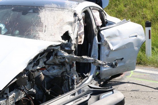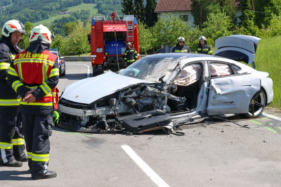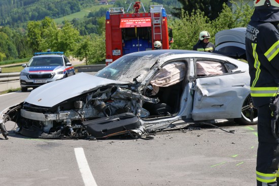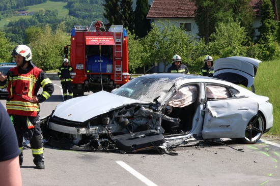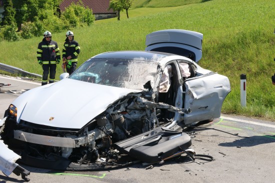 Ein teurer Sportwagen ist Dienstagnachmittag auf der B120 Scharnsteiner Straße bei Gschwandt (Bezirk Gmunden) in einen entgegenkommenden Schotter-LKW gekracht.