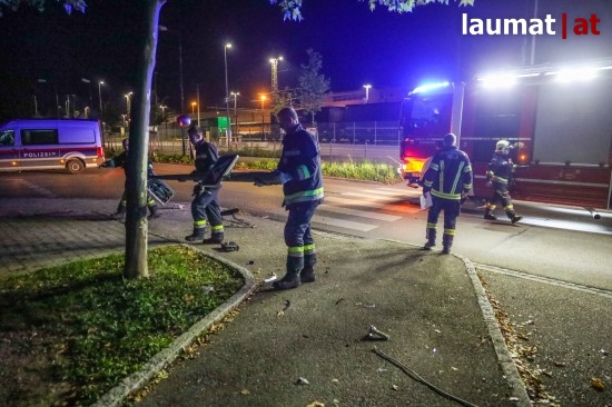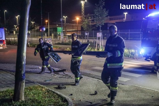 Die Einsatzkräfte von Feuerwehr, Polizei und Energieversorgungsunternehmen standen in der Nacht auf Donnerstag in Wels-Neustadt nach einem Verkehrsunfall im Einsatz.