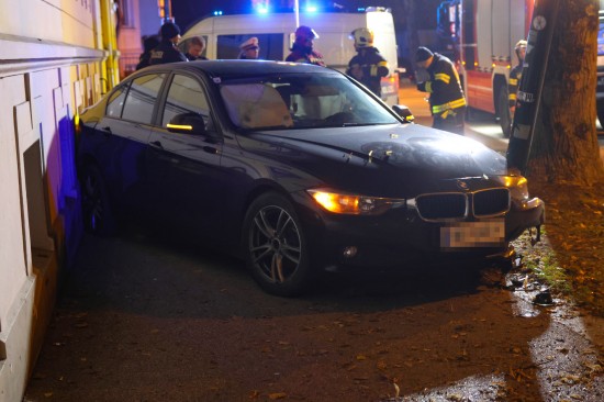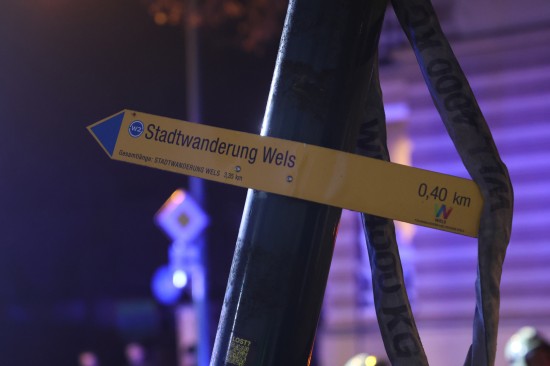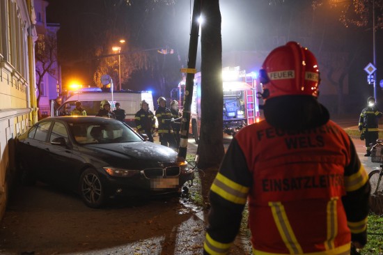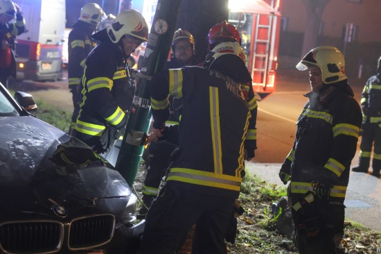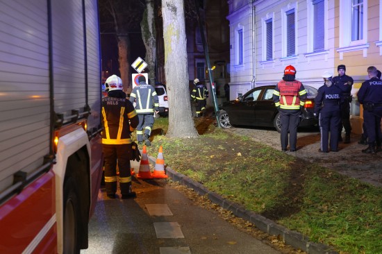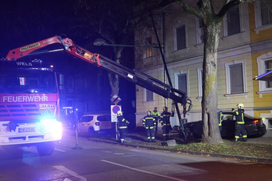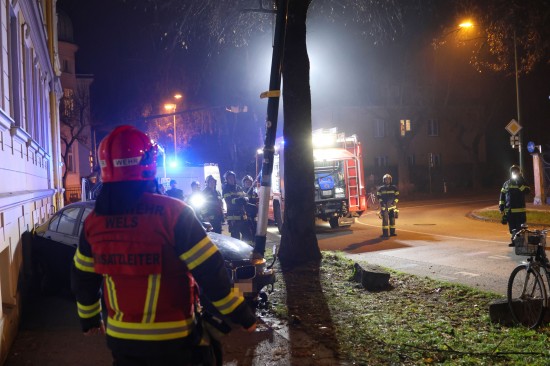 Feuerwehr im Einsatz: Auto in Wels-Innenstadt gegen Straßenbeleuchtung gekracht