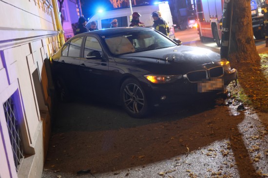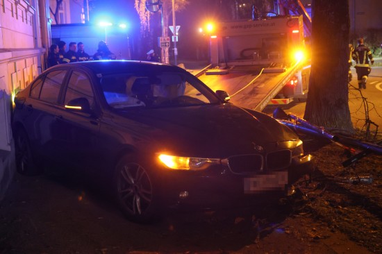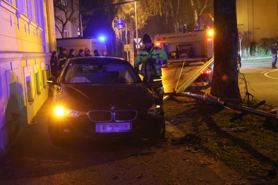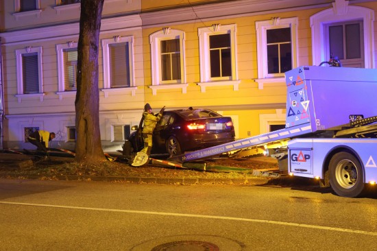 Ein Auto ist am späten Sonntagabend in Wels-Innenstadt am Ausgang der Kurve von der Straße abgekommen, auf eine Grüninsel gelangt und dann gegen eine Straßenbeleuchtung gekracht.