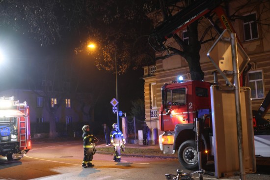 Der Unfall passierte am späten Sonntagabend in der Adlerstraße im Kreuzungsbereich mit der Kolpingstraße und der Volksgartenstraße. Der PKW fuhr dort aus noch unbekannten Gründen über eine Grüninsel und krachte gegen einen Straßenbeleuchtungsmast. Die Feuerwehr wurde zur Demontage des schwer beschädigten Mastens alarmiert. Nachdem ein Techniker die Beleuchtung abgeklemmt hatte, konnten die Einsatzkräfte der Feuerwehr mit der Demontage beginnen. Mittels Kran wurde der beschädigte Lichtmast entfernt. Ein Abschleppunternehmen führte in weiterer Folge die Bergung des Unfallfahrzeuges durch.