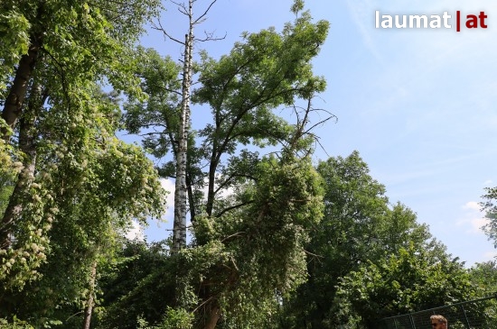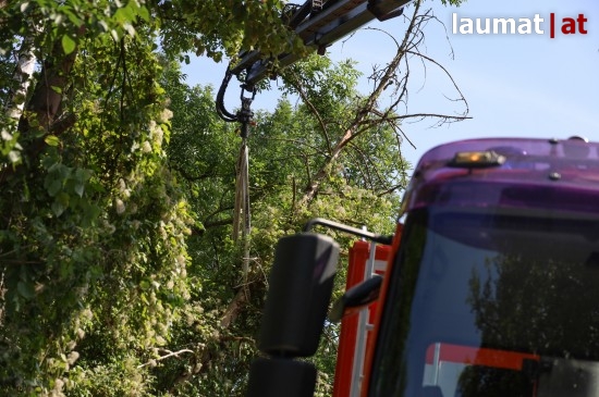 Die Feuerwehr wurde von einem Mitarbeiter der Stadt Wels verständigt, dass in der Tierheimstraße ein Baum umzustürzen droht. Diese Situation bestätigte sich vor Ort. Ein Baum war in Schräglage geraten, da er offenbar von einer sogenannten Stockfäule betroffen war. Weil der Baum zwischen einem Telefonmast und einem Zaun hing und gegenüberliegend ebenfalls ein Zaun ist, wurde ein Kran sowie eine Hubbühne angefordert, um den Baum abzutragen beziehungsweise zu fällen.