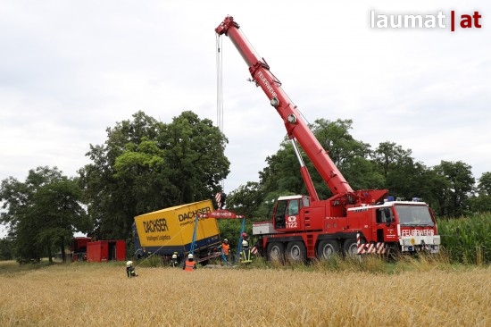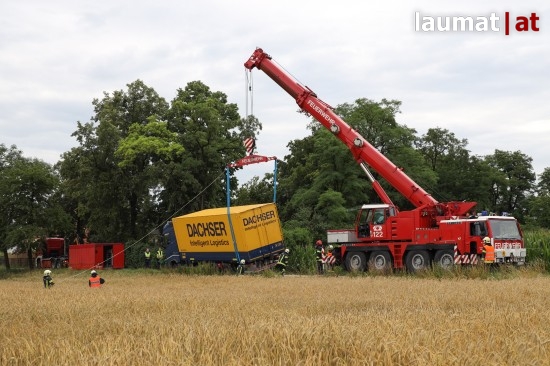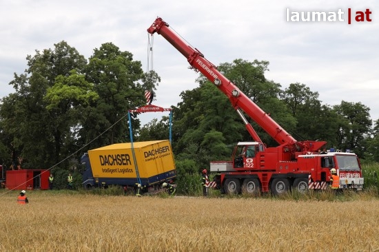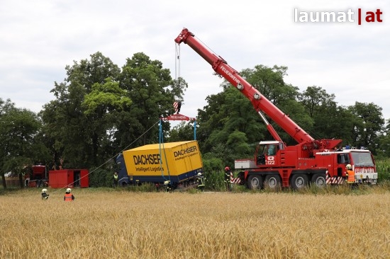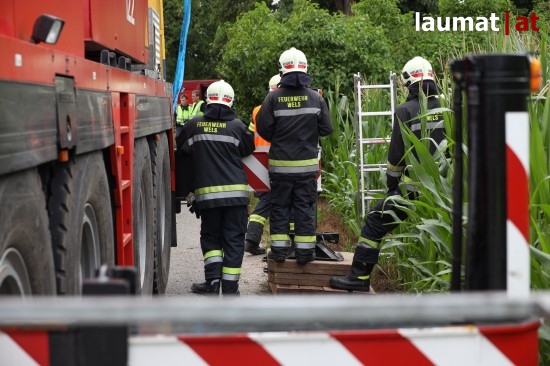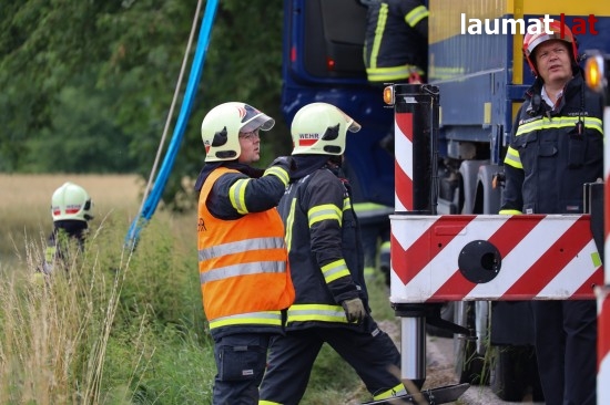 Feuerwehr mit Kranfahrzeug bei LKW-Bergung in Wels-Schafwiesen im Einsatz