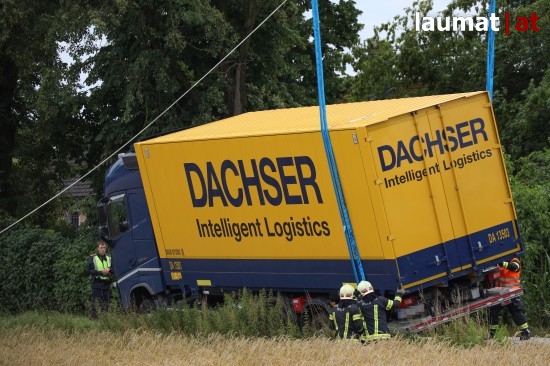 Ein LKW drohte Dienstagvormittag in Wels-Schafwiesen umzustürzen. Die Feuerwehr stand mit dem Kranfahrzeug im Einsatz, um den LKW wieder zurück auf die Straße zu heben.