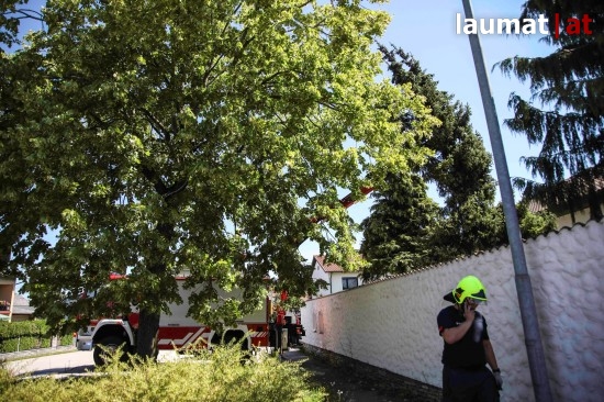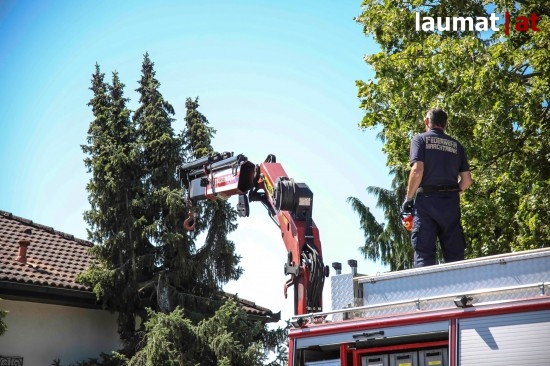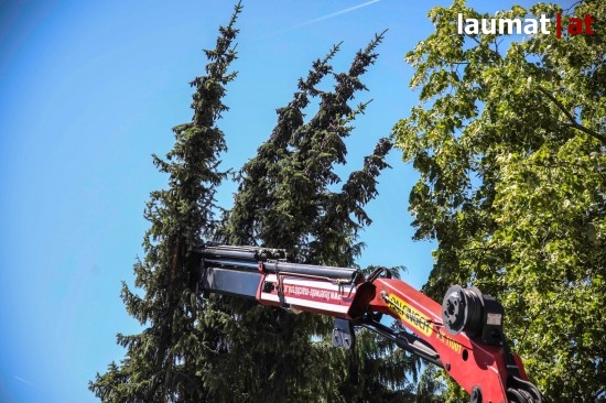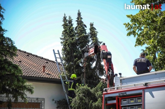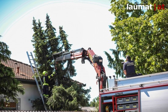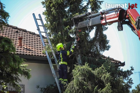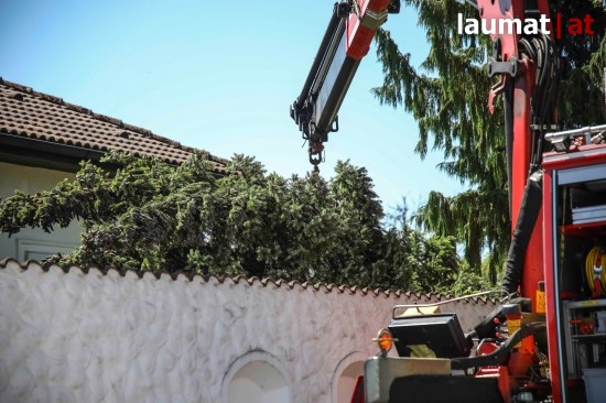 Marchtrenk. Die Feuerwehr stand Montagvormittag in Marchtrenk (Bezirk Wels-Land) im Einsatz um einen Baum zu entfernen, der sich an ein Haus angelehnt hatte.