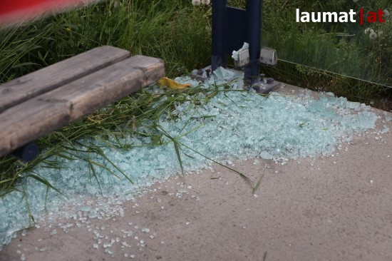 Die Glassplitter einer Scheibe der Bushaltestelle lagen zwar bereits mindestens seit Freitagmittag, Samstagfrüh wurde dann die Feuerwehr mit Absperrband und Besen an die Einsatzstelle beordert um die beschädigte Bushaltestelle abzusperren und die Glassplitter von Fahrbahn und Gehsteig zu beseitigen.