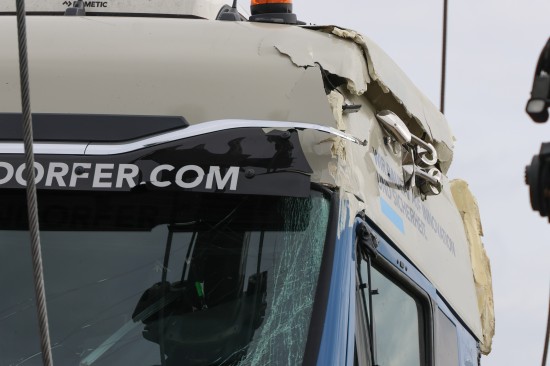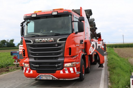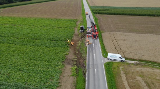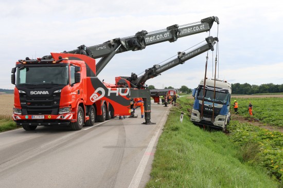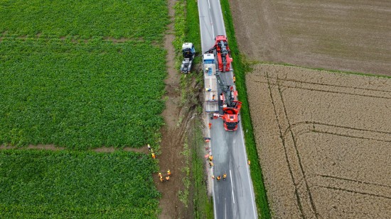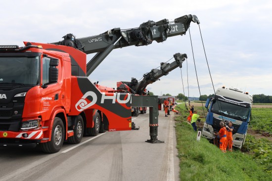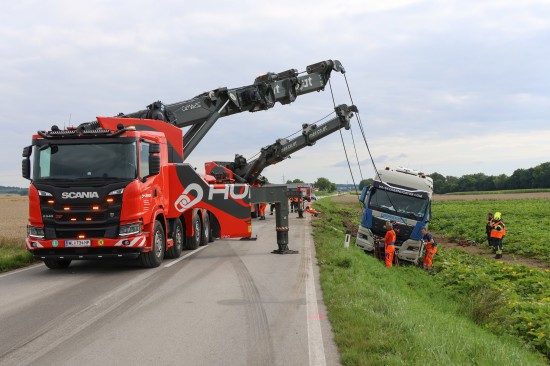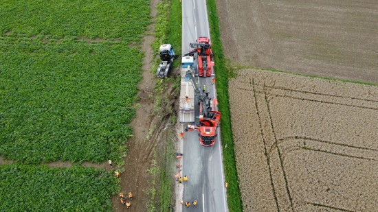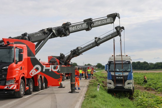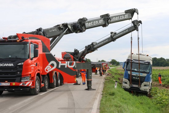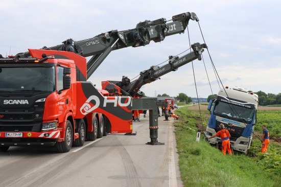 Größere Bergeaktion: LKW mit Betonfertigteilen auf Wiener Straße bei Schlatt von Straße abgekommen