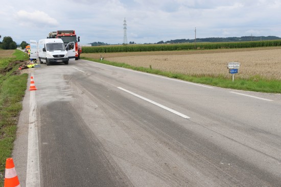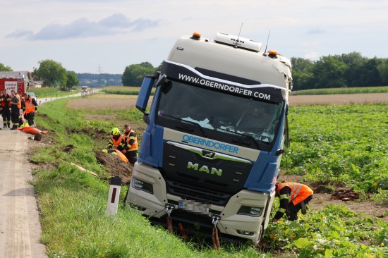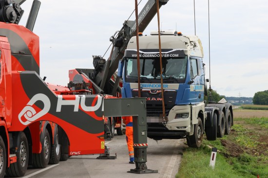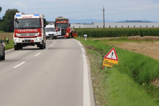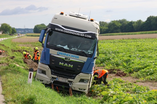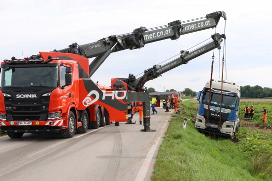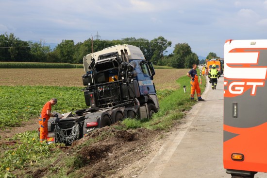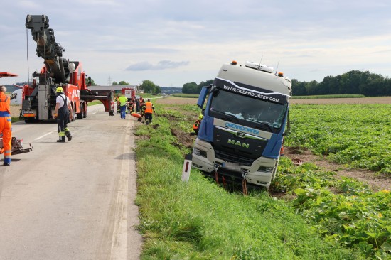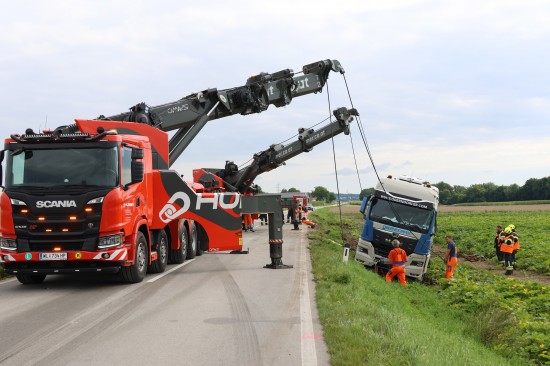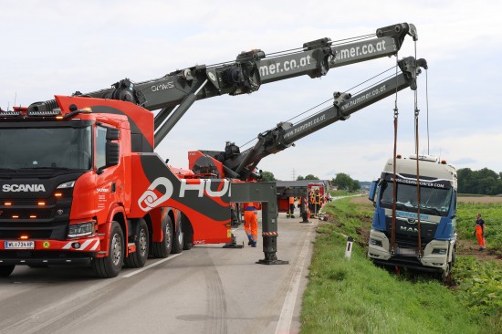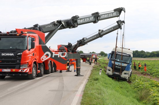 Neukirchen bei Lambach/Schlatt. Ein LKW mit Betonfertigteilen ist Montagfrüh auf der B1 Wiener Straße an der Gemeindegrenze zwischen Neukirchen bei Lambach (Bezirk Wels-Land) und Schlatt (Bezirk Vöcklabruck) von der Straße abgekommen.