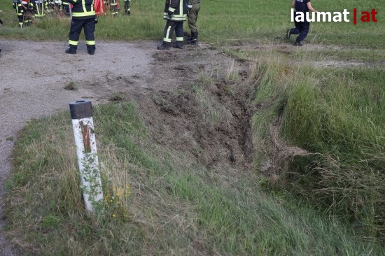 Ein PKW kam rechts von der Fahrbahn ab und überschlug sich nach einer Kollision mit einem Wasserdurchlass im Bereich der angrenzenden Straßenböschung beziehungsweise Wiese. Die Einsatzkräfte der Feuerwehr wurden zur Rettung eingeklemmter Personen alarmiert.