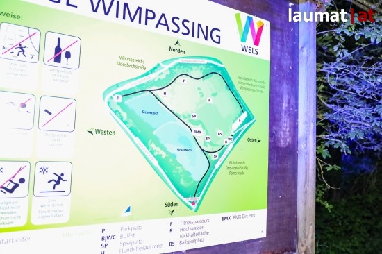 Die Irrfahrt mit einem Auto am späten Sonntagabend in Wels durch die Freizeitanlage Wimpassing im Welser Stadtteil Vogelweide endete für die Lenkerin beinahe im dortigen Sickerteich.