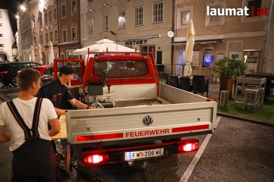 Einsatzkräfte der Feuerwehr und Polizei standen in der Nacht auf Montag in Wels-Innenstadt im Einsatz, um eine Scheibe eines Imbiss-Lokals zu verschalen.