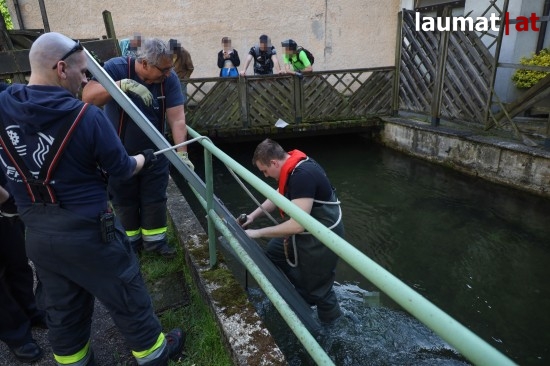 Einsatzkräfte der Feuerwehr waren Samstagabend in Wels-Innenstadt im Einsatz, um eine Kennzeichentafel aus dem Welser Mühlbach zu bergen.