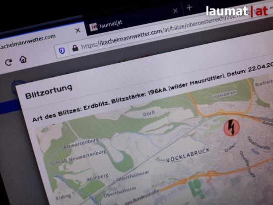 Die Blitzortung von kachelmannwetter.com registrierte einen starken Blitzeinschlag - Erdblitz mit 196kA - am Einsatzort, zu dem die Feuerwehr wegen des Brandverdachts gerufen wurde.