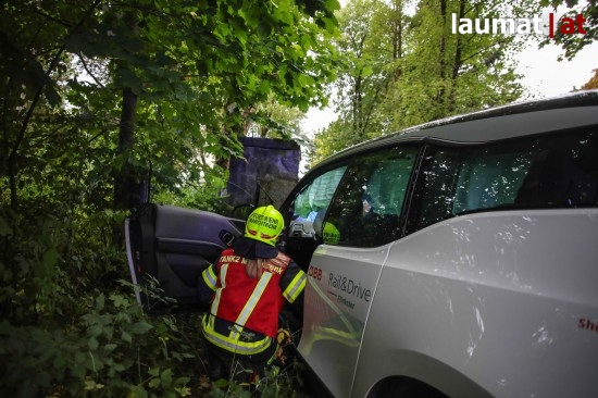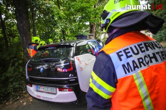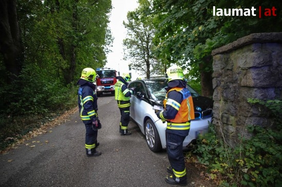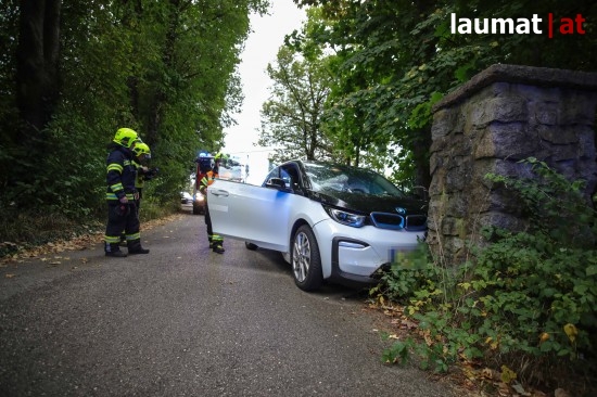 Leihelektroauto gegen Säule des Einfahrtstores eines Betriebsgeländes in Marchtrenk gekracht