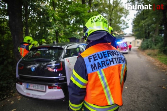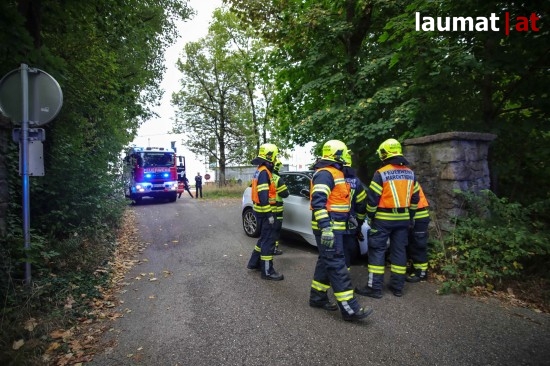 In Marchtrenk (Bezirk Wels-Land) ist Montagnachmittag ein Leih-E-Auto mit einer Säule eines Einfahrtstores zu einem Firmengelände kollidiert.