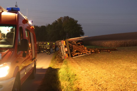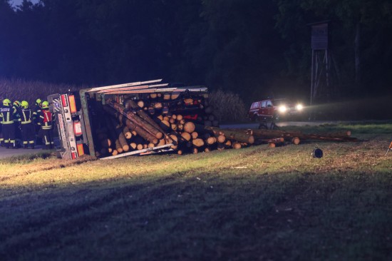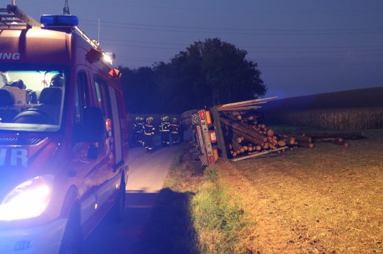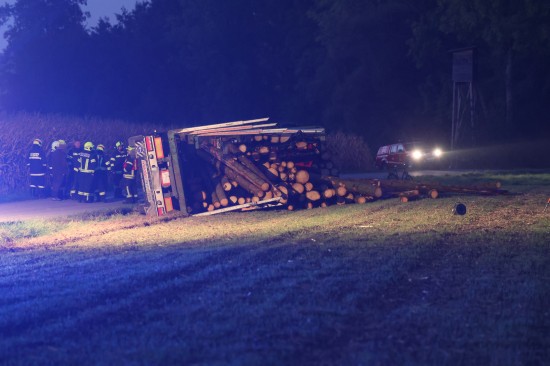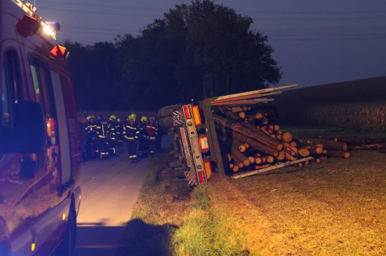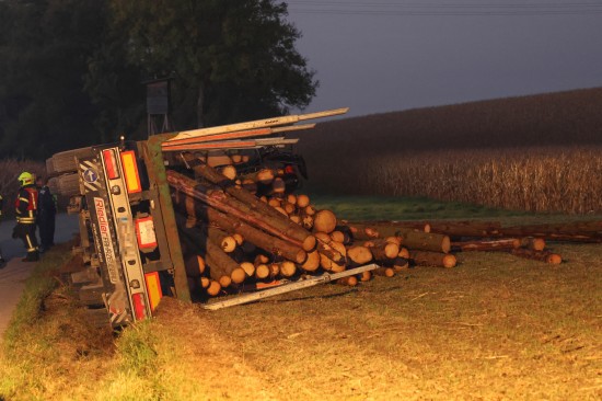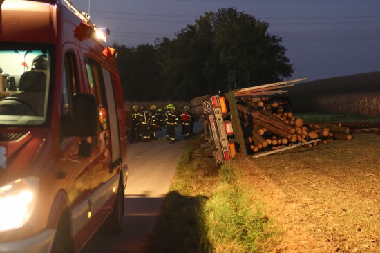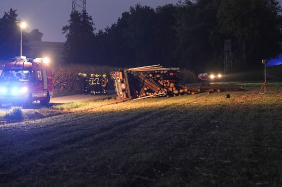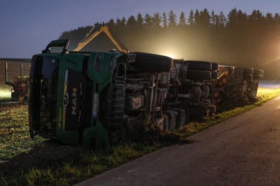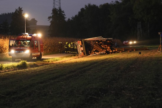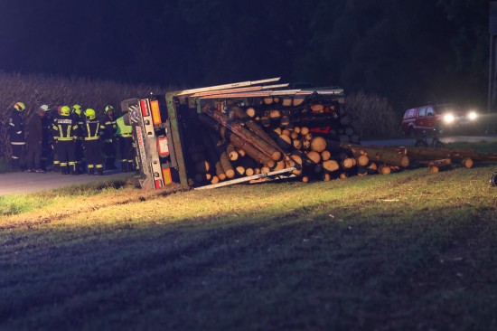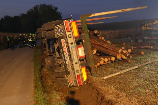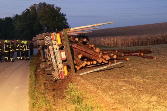 In Aurolzmünster (Bezirk Ried im Innkreis) ist Dienstagabend ein Holztransporter umgestürzt. Der Lenker überstand den Unfall mit leichten Verletzungen.