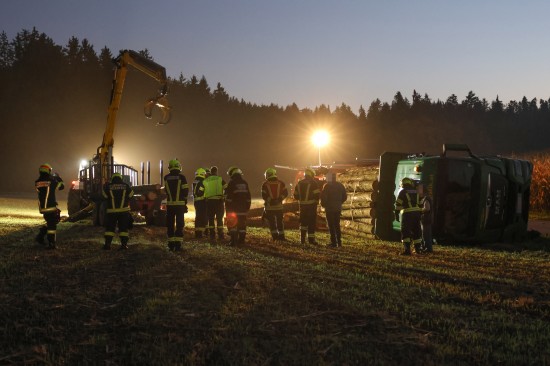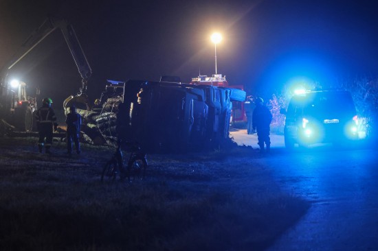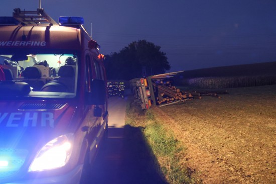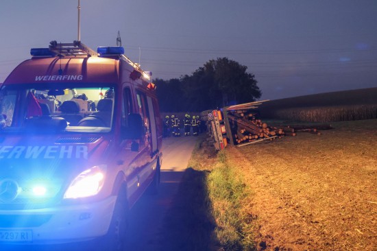 Der Unfall passierte Dienstagabend auf einer schmalen Straße in Weierfing im Gemeindegebiet von Aurolzmünster. Ein Lenker eines Holztransporters kam aus noch unbekanntem Grund seitlich von der Fahrbahn ab, woraufhin der LKW samt Anhänger ins angrenzende Feld umstürzte. Die Einsatzkräfte dreier Feuerwehren wurden zur Personenrettung nach dem LKW-Unfall alarmiert. Der Lenker war zum Glück nicht eingeklemmt, er überstand den Unfall mit leichten Verletzungen. Nach der Erstversorgung am Einsatzort wurde er mit der Rettung ins Krankenhaus Barmherzige Schwestern Ried eingeliefert. Mit einem Traktor wurde zwischenzeitlich damit begonnen, die Holzladung abzuladen. Für die Bergung des verunfallten LKW samt Anhänger wurde ein LKW-Bergeunternehmen angefordert.
