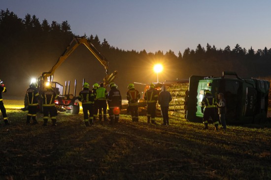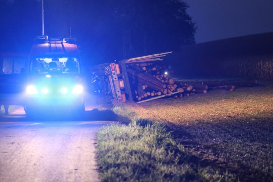 Lenker leicht verletzt: Vollbeladener Holztransporter in Aurolzmünster umgestürzt