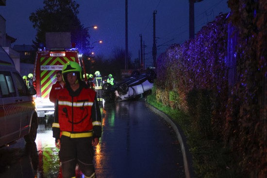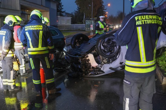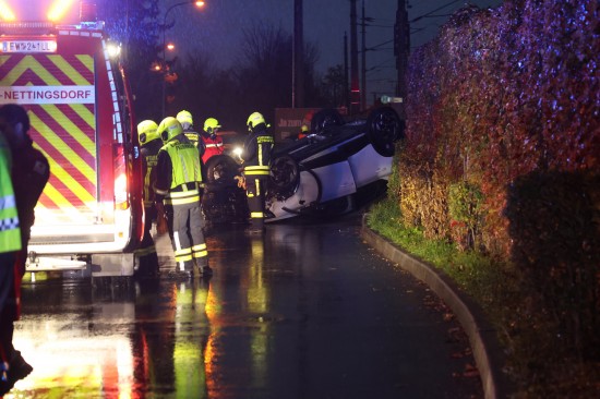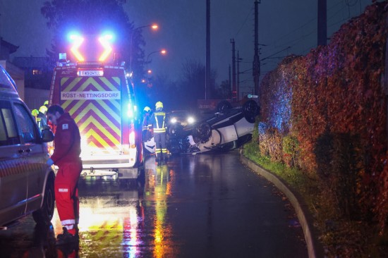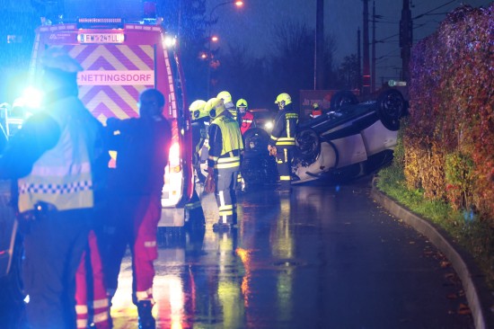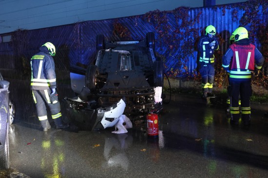 Der Unfall passierte auf der Bahnhofstraße in der Ortschaft Nettingsdorf im Gemeindegebiet von Ansfelden. Aus noch unbekannten Gründen kollidierte eine ältere Autolenkerin offenbar mit einem am Fahrbahnrand abgestellten PKW. Ihr Fahrzeug überschlug sich daraufhin und kam am Dach liegend zum Stillstand. Die Einsatzkräfte dreier Feuerwehren wurden zur Personenrettung nach dem Verkehrsunfall alarmiert. Die Frau war zum Glück nicht eingeklemmt, sondern nur anfangs kurz im Fahrzeug eingeschlossen. Sie überstand den Unfall offenbar leicht verletzt und wurde nach der Erstversorgung am Unfallort mit dem Rettungsdienst ins Krankenhaus gebracht. Die Kräfte der Feuerwehr führten die Aufräumarbeiten durch. Die Unfallfahrzeuge wurdem vom verständigten Abschleppdienst abtransportiert.