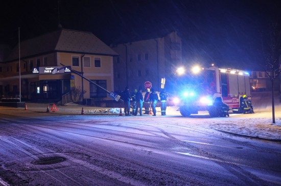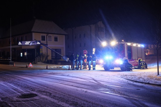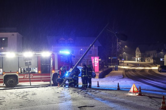 Lichtmast angefahren: Feuerwehr bei Sicherungseinsatz im Ortszentrum von Sattledt im Einsatz