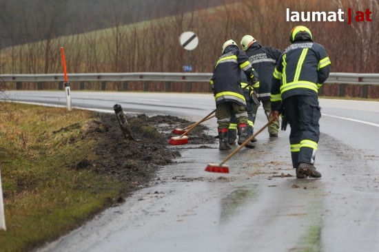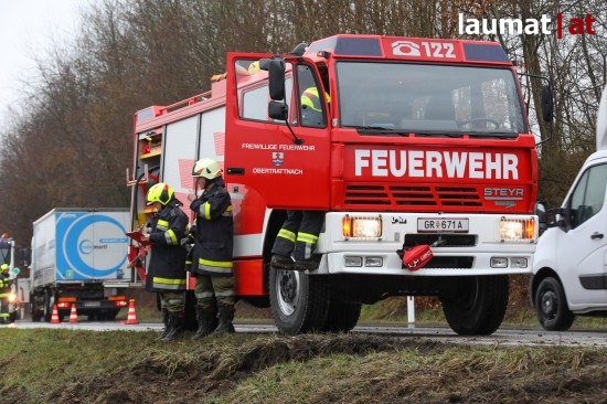LKW bei Unfall auf Innviertler Straße in Taufkirchen an der Trattnach über Böschung gestürzt