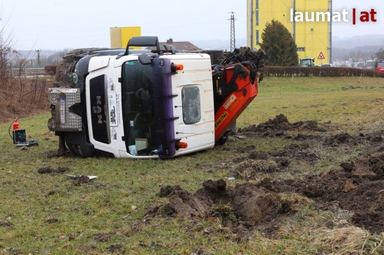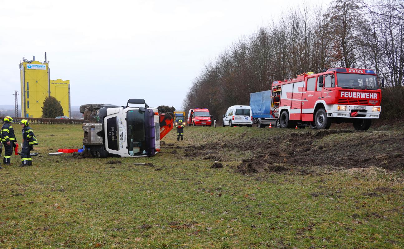 Taufkirchen an der Trattnach. Ein LKW ist Freitagvormittag auf der Innviertler Straße in Taufkirchen an der Trattnach (Bezirk Grieskirchen) von der Straße abgekommen und umgestürzt.