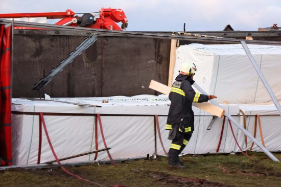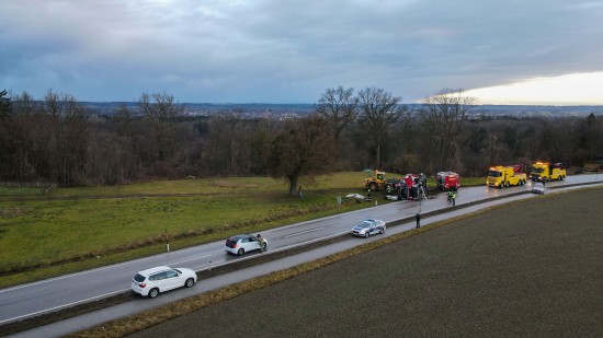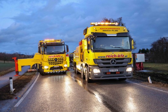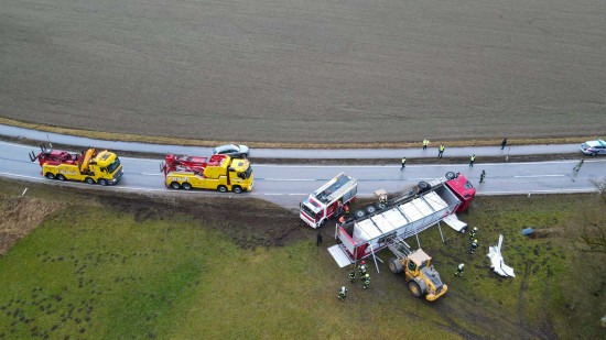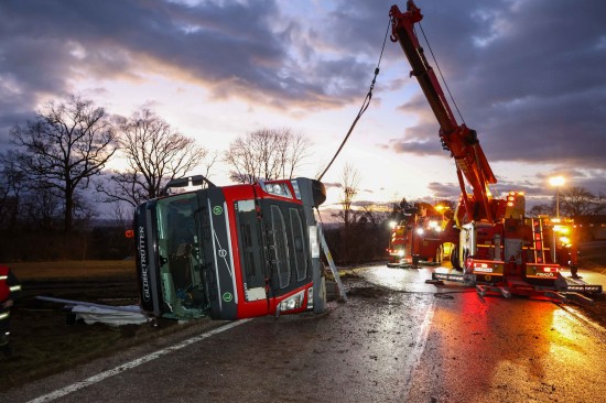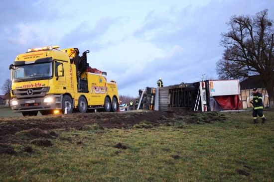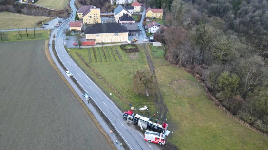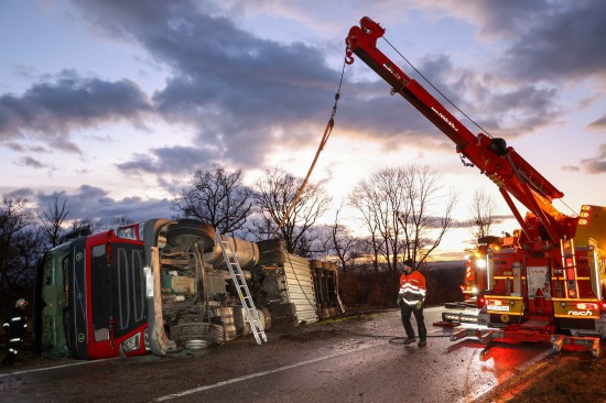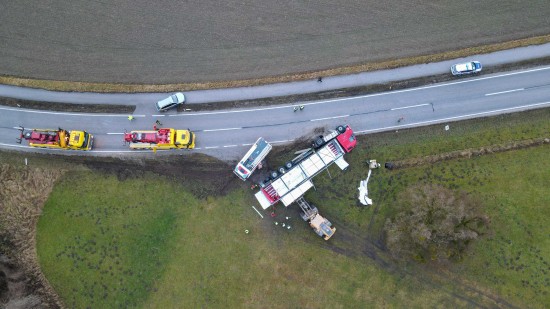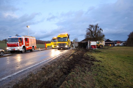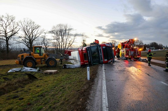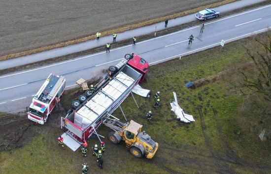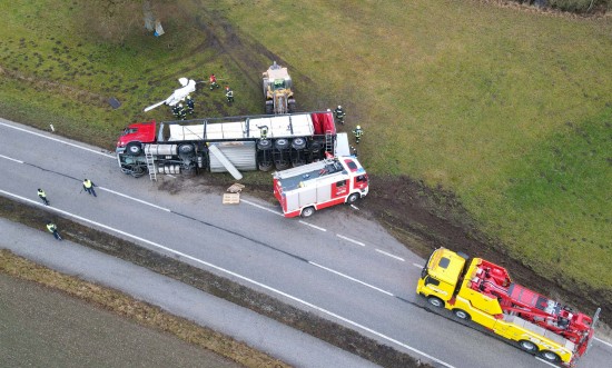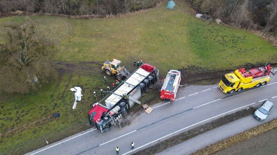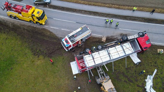 Umfangreich gestaltete sich am Mittwoch die Bergung eines umgestürzten LKW-Sattelzuges in Wildshut im Gemeindegebiet von St. Pantaleon (Bezirk Braunau am Inn).