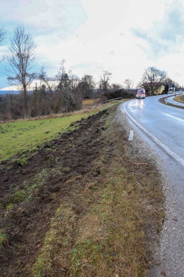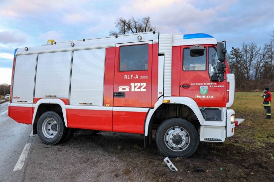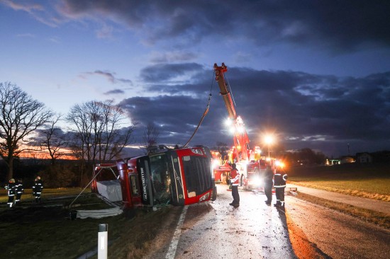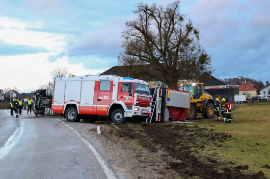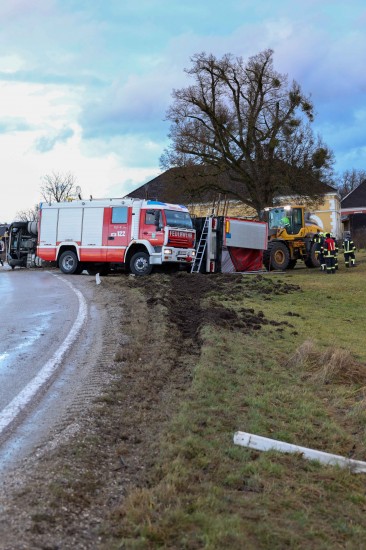 Der LKW kam aus bisher unbekannten Gründen auf der Weilhartstraße in der Ortschaft Wildshut, im Gemeindegebiet von St. Pantaleon, von der Fahrbahn ab und stürzte schließlich um.