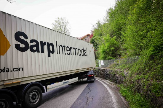 LKW-Sattelzug blieb bei Hochburg-Ach in Kehre stecken