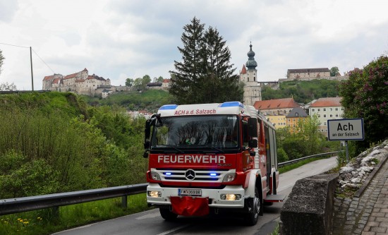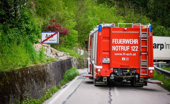 Der LKW wollte offenbar aufgrund der Sperre der B148 Altheimer Straße bei Braunau am Inn über Hochburg-Ach ausweichen. Dort unterschätzte er aber eine enge Kehre der L501 Weilhartstraße am Acherberg, in der er sozusagen steckengeblieben ist. Zwei Feuerwehren und die Polizei standen im Einsatz. Ausgelaufene Betriebsmittel mussten gebunden werden.
