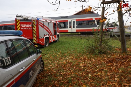 Lokalbahn kollidiert auf Bahnübergang in Waizenkirchen mit LKW-Anhänger