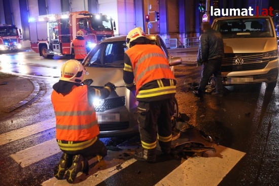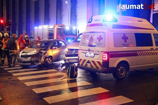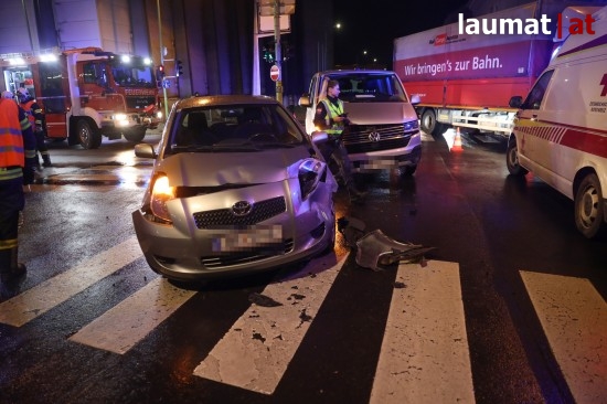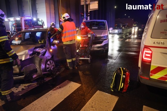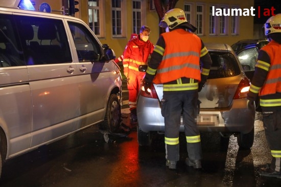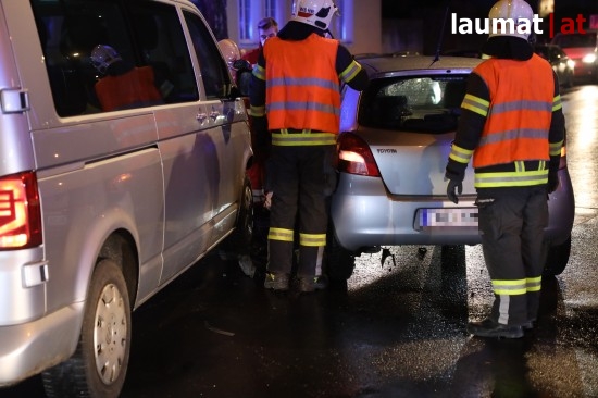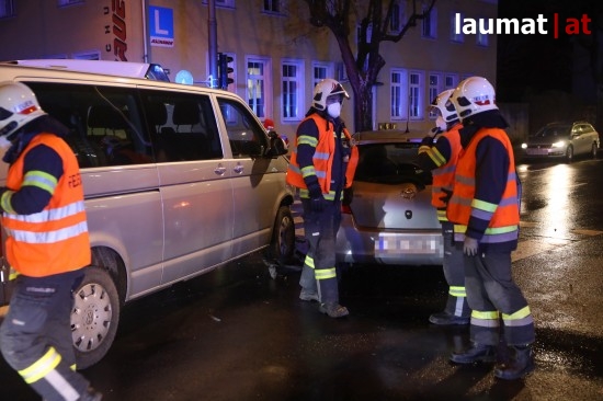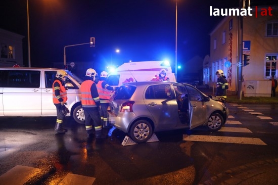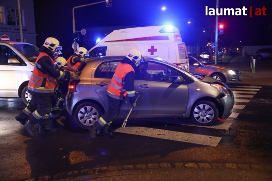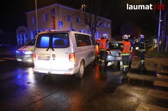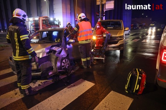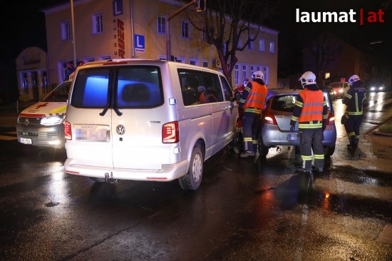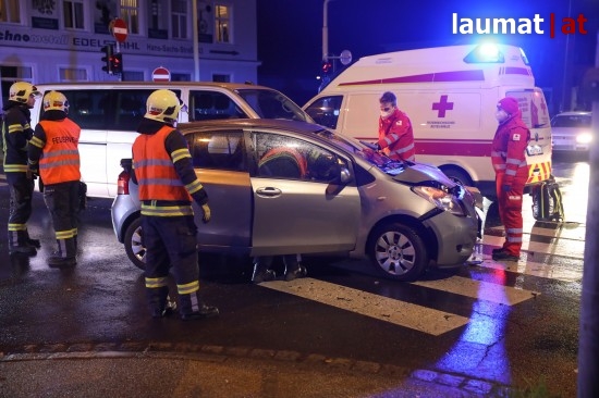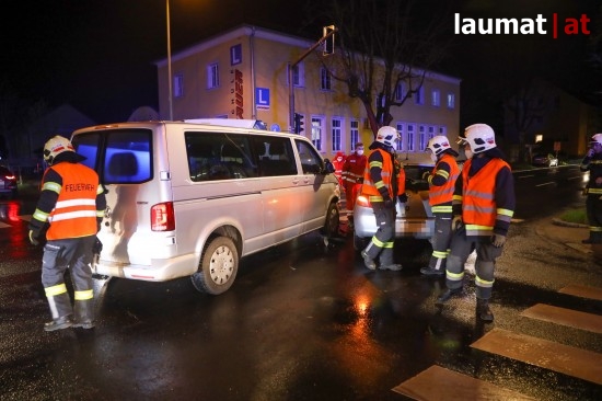 Im Kreuzungsbereich der B1 Wiener Straße beziehungsweise Doktor-Groß-Straße mit der Magazinstraße kam es zu einer Kollision zwischen einem Taxibus und einem PKW. Die Unfallfahrzeuge kamen im spitzen Winkel zueinander zum Stillstand. Die verletzte Autolenkerin konnte des Unfallfahrzeug vorerst nicht verlassen, sie musste von der Feuerwehr befreit werden. Die Einsatzkräfte setzten dazu den Taxibus ein Stück zurück und konnten dann die verformte Fahrzeugtüre öffnen. Die PKW-Lenkerin wurde nach der Erstversorgung durch den Rettungsdienst ins Klinikum Wels eingeliefert. Die Feuerwehr verbrachte die Autos auf einen angrenzenden Parkplatz und reinigte die Fahrbahn.