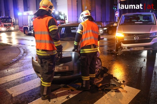 Feuerwehr und Rettung standen Mittwochfrüh nach einem schweren Kreuzungscrash zwischen einem PKW und einem Taxibus in Wels-Pernau im Einsatz. Eine eingeschlossene Autolenkerin musste befreit werden.