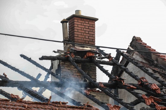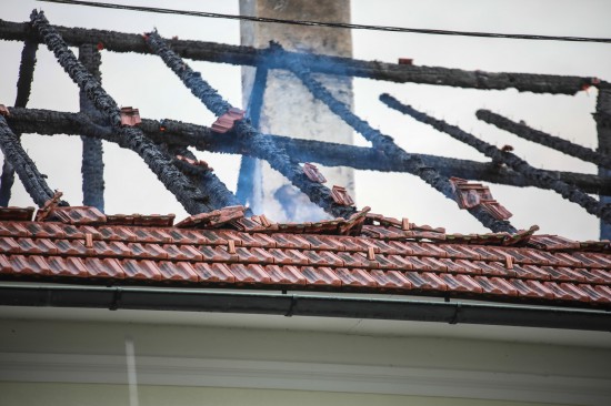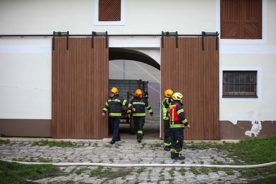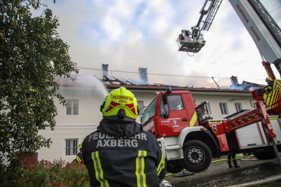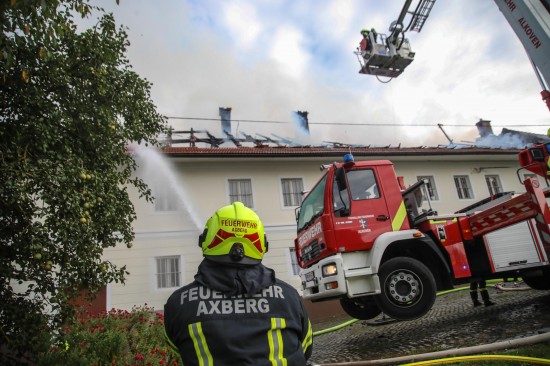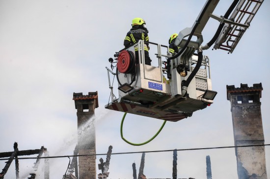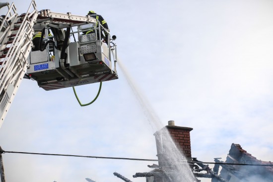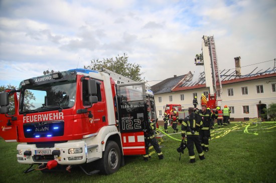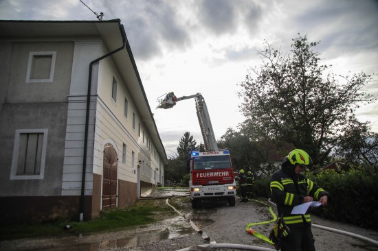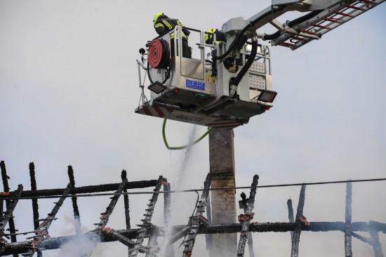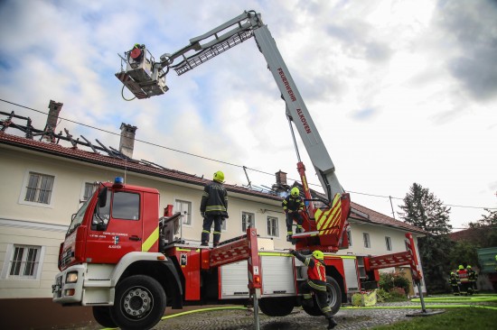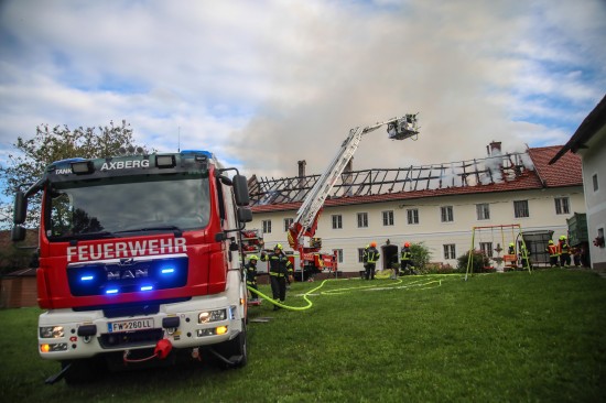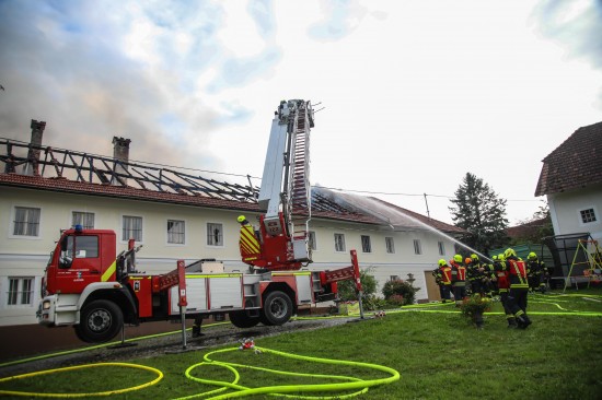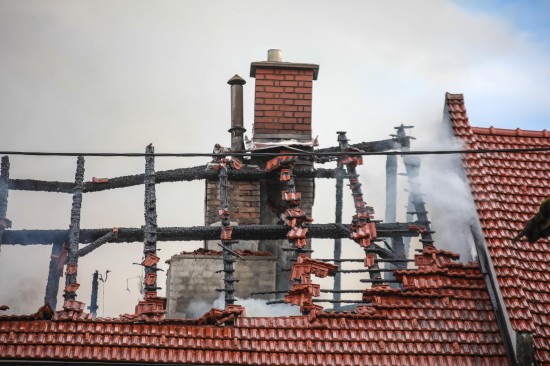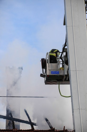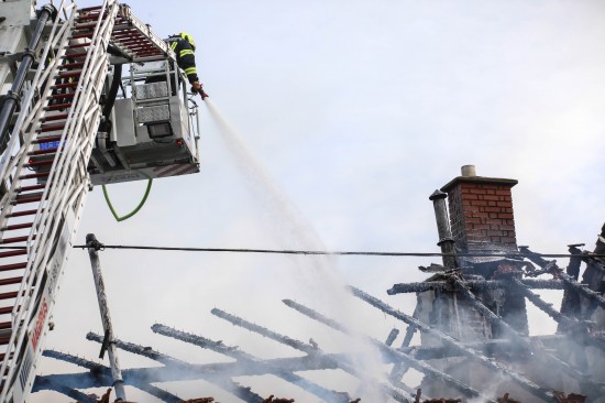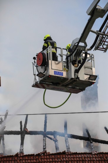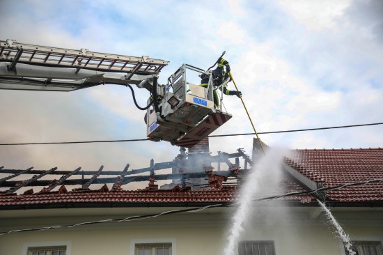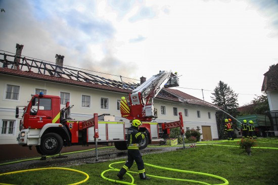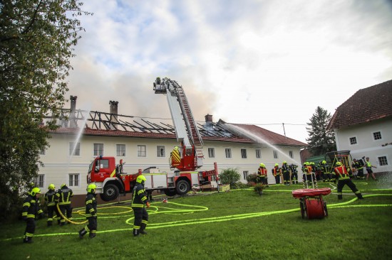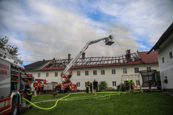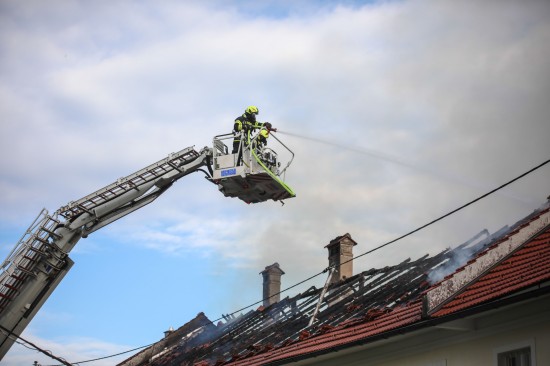 Das Dach eines Gebäudetraktes eines Vierkanters in Kirchberg-Thening (Bezirk Linz-Land) ist am Mittwochnachmittag in Flammen aufgegangen. Neun Feuerwehren standen bei den Löscharbeiten im Einsatz.
