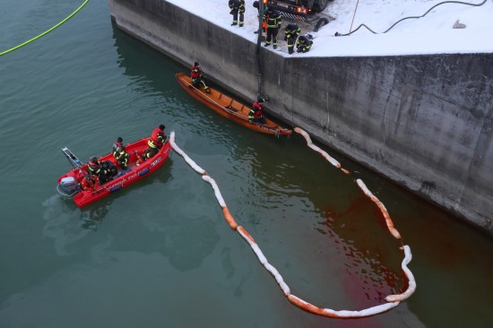 Lambach. Einen langwierigen Einsatz bei frostigen Temperaturen hatten die Einsatzkräfte der Feuerwehr am Samstagnachmittag in Lambach (Bezirk Wels-Land) zu bewältigen. Ein größerer Ölaustritt in der Traun war der Grund.