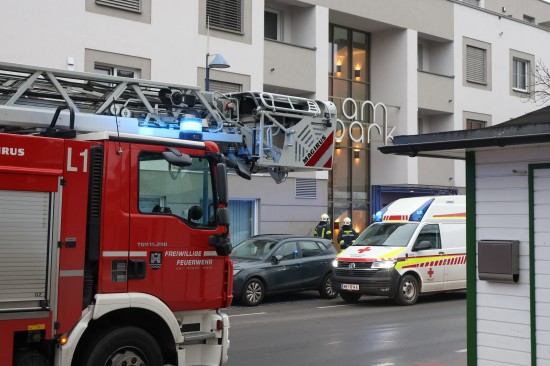 Feuerwehr, Rettung und Polizei standen Donnerstagnachmittag bei einer Personenrettung in einem Wohn- und Geschäftsgebäude in Wels-Neustadt im Einsatz.