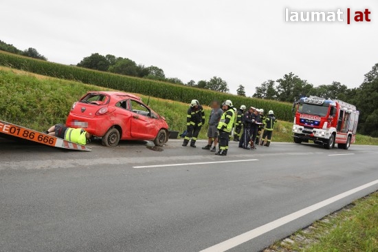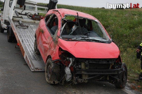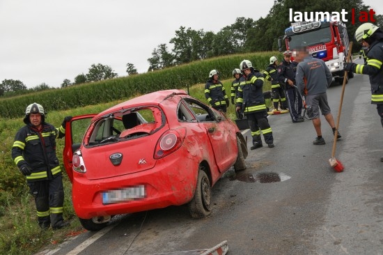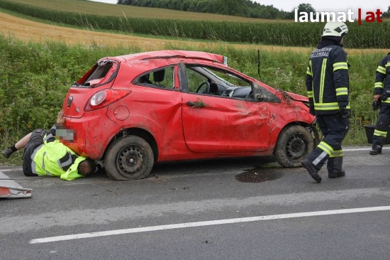 Ein Auto hat sich während der Fahrt auf der Innviertler Straße im Gemeindegebiet von Grieskirchen aus bisher unbekannter Ursache überschlagen und seitlich liegend zum Stillstand gekommen.