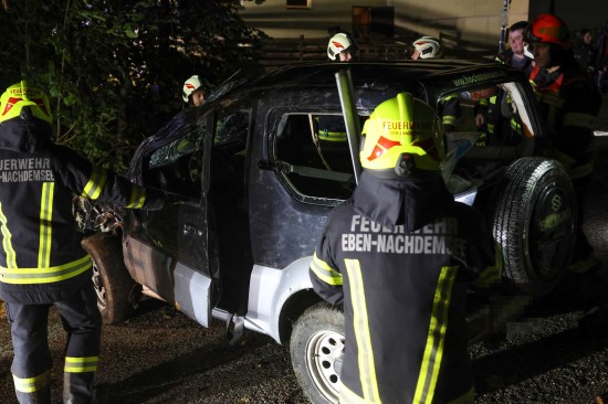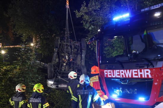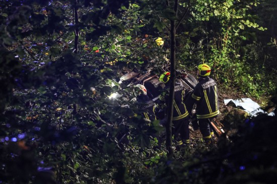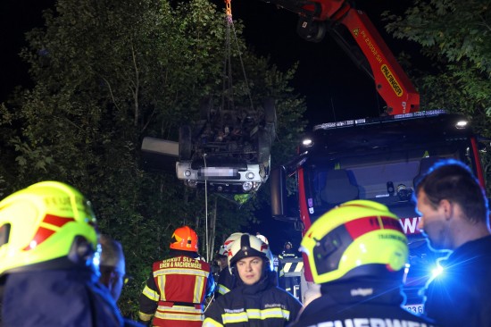 Personenrettung: Auto bei Unfall in Traunkirchen über steilen Abhang in Bachbett abgestürzt