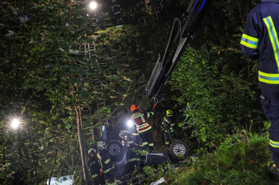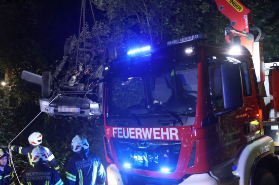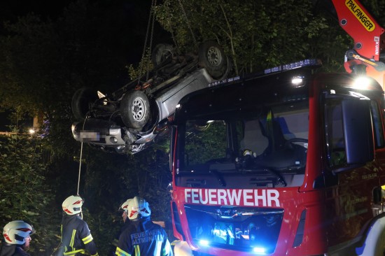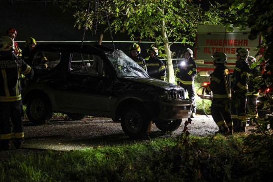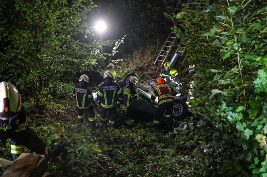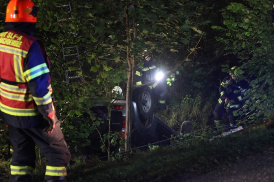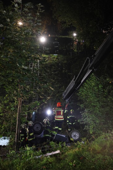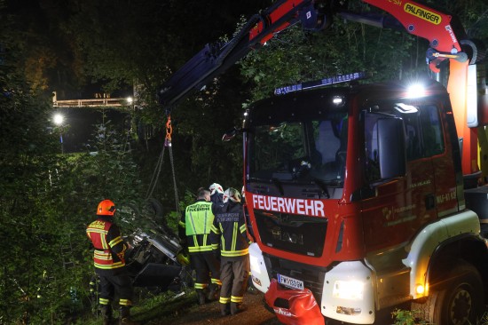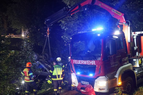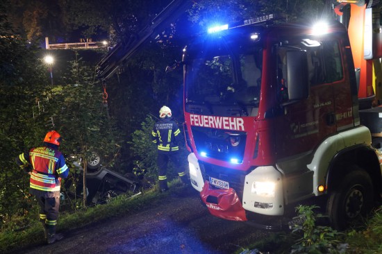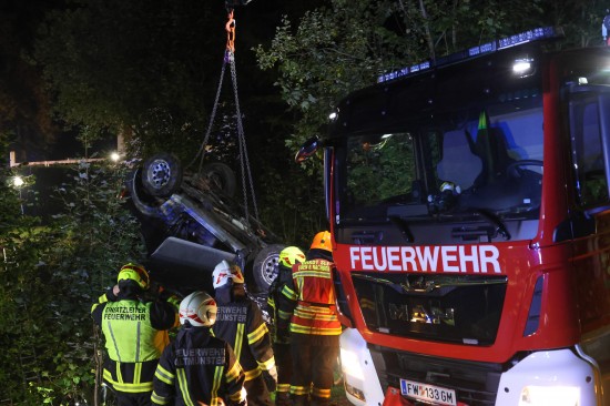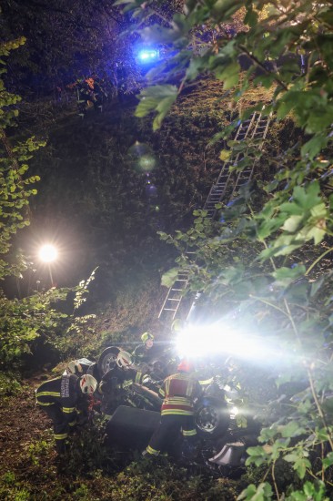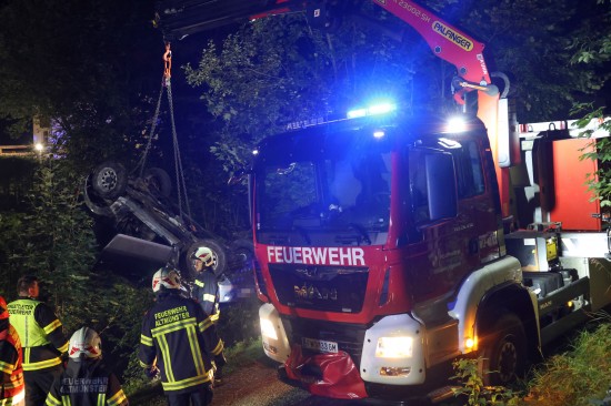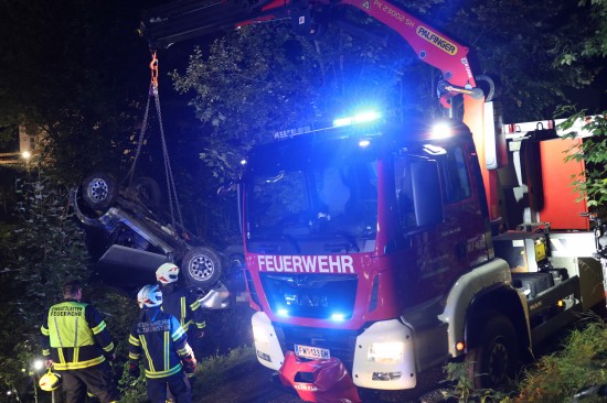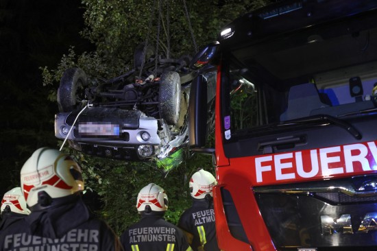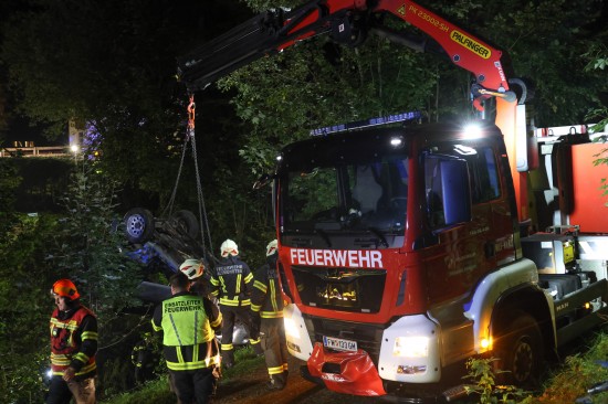 Der Unfall passierte Montagabend im Bereich Mühlbachberg beziehungsweise Attweng im Gemeindegebiet von Traunkirchen. Ein Fahrzeuglenker ist aus noch unbekannten Gründen mit seinem Wagen verunfallt, von der Straße abgekommen und hat sich über die steile Böschung in das Bachbett des Burgsteingraben überschlagen, wo der PKW auf dem Dach liegend zum Stillstand kam. Die Einsatzkräfte der Feuerwehr begaben sich von beiden Seiten her über den steilen Hang zum Fahrzeug. Der Lenker war im überschlagenen Fahrzeug eingeschlossen. Die Rettungsaktion gestaltete sich aufgrund der vorgefundenen Situation schwierig, konnte aber rasch durchgeführt werden. Nachdem die Hecktüre des Fahrzeuges geöffnet werden konnte, konnte auch der Lenker rasch befreit werden. Der Verletzte wurde dann über den Hang zum Rettungsfahrzeug gebracht und in weiterer Folge nach notärztlicher Erstversorgung ins Klinikum gebracht. Die Bergung des verunfallten Fahrzeuges erfolgte mittels Kran der Feuerwehr. Das geborgene Fahrzeug wurde dann vom Abschleppdienst abgeholt.
