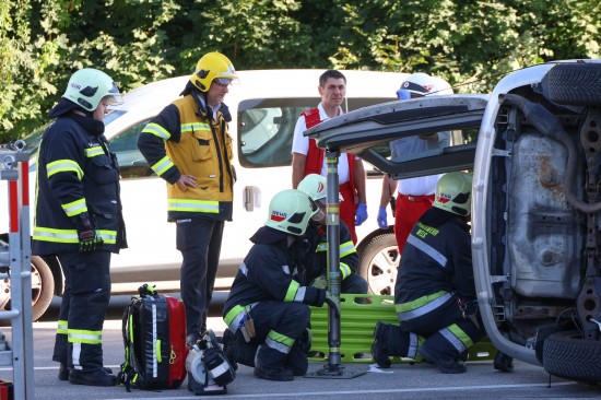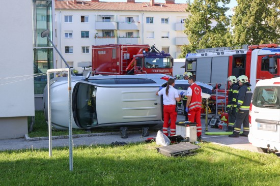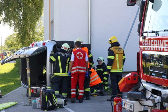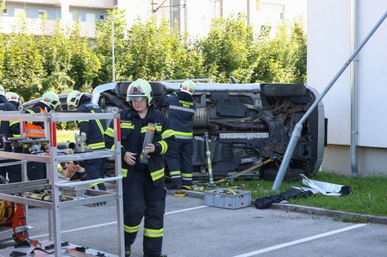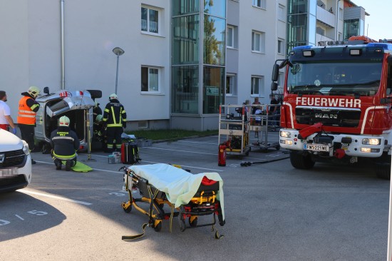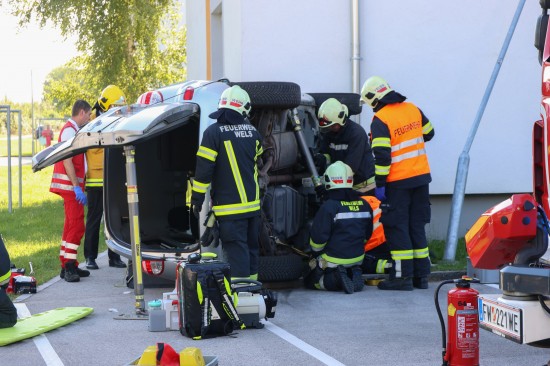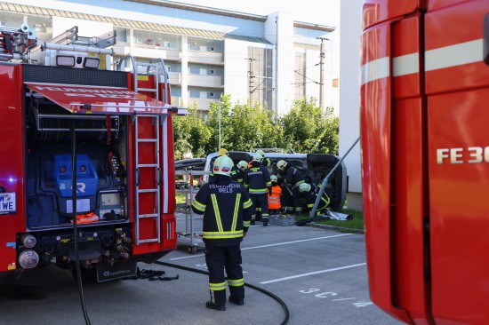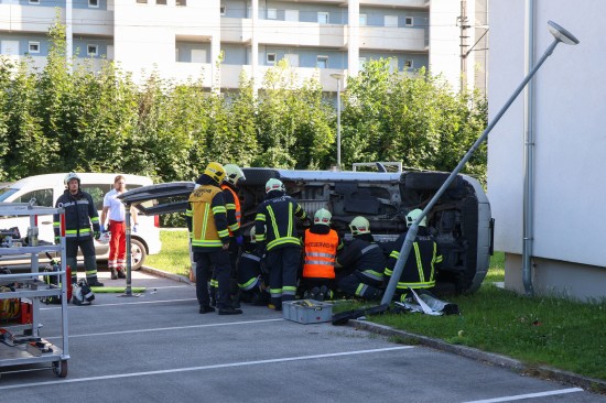 Personenrettung: Lenkerin nach Parkplatzunfall bei Wohnanlage in Wels-Vogelweide aus Auto gerettet
